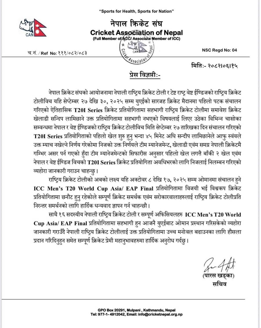 वेस्ट इन्डिजविरुद्धको पहिलो खेल अस्वीकार गरेकाले उनलाई पूरै (तीन) खेल नै खेल्न नपाउने गरी कार्वाही गरिएकाे क्यानका सचिव पारस खड्काले जानकारी दिए ।