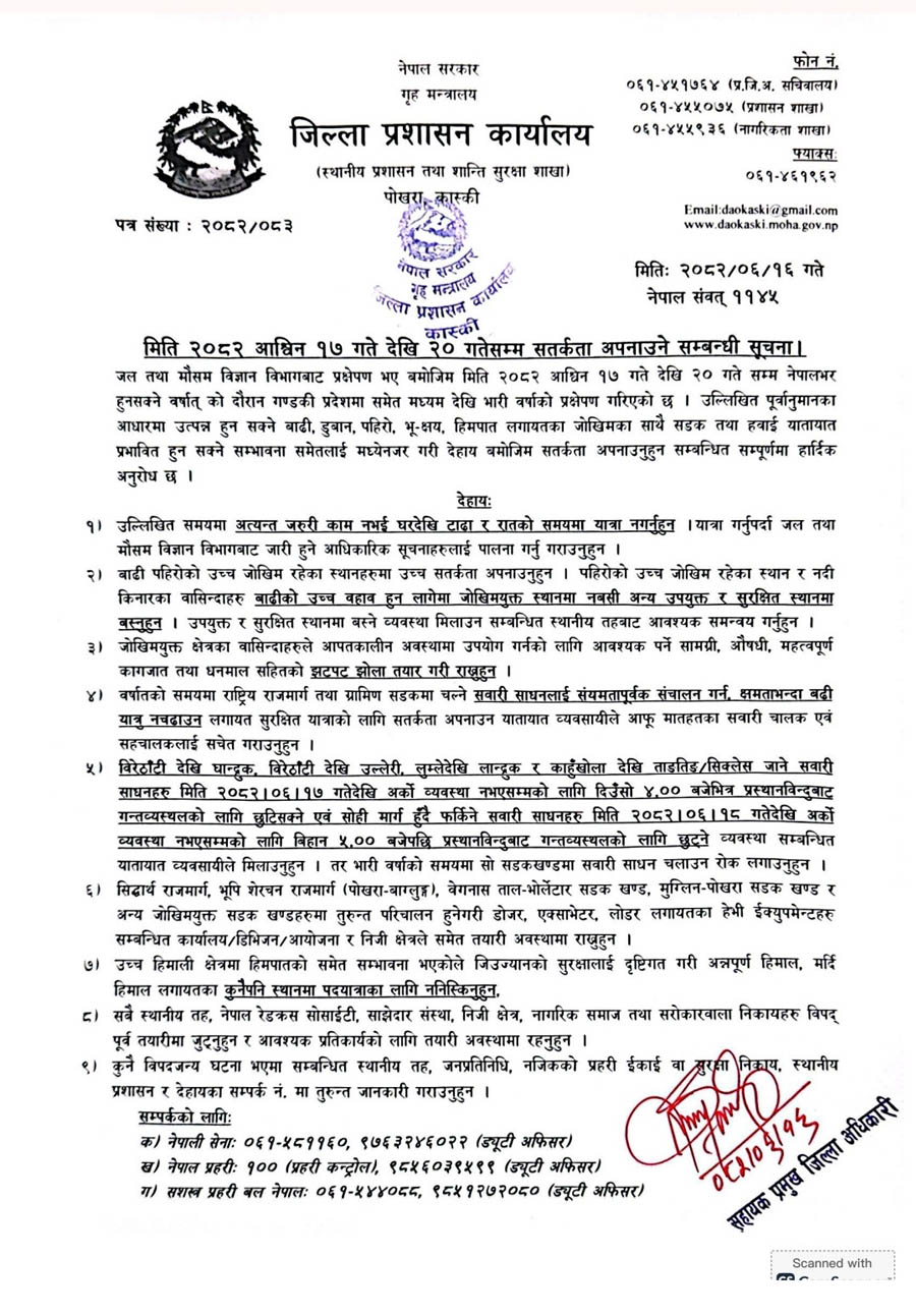पोखरा । जिल्ला प्रशासन कार्यालय कास्कीले असोज १७ देखि २० गतेसम्म अत्यावश्यक कामबाहेक घरदेखि टाढा नजान र रातको समयमा यात्रा नगर्न आग्रह गरेको छ । जिल्ला प्रशासनले बिहीबार एक सूचना जारी गर्दै यस्तो आग्रह गरेको हो ।